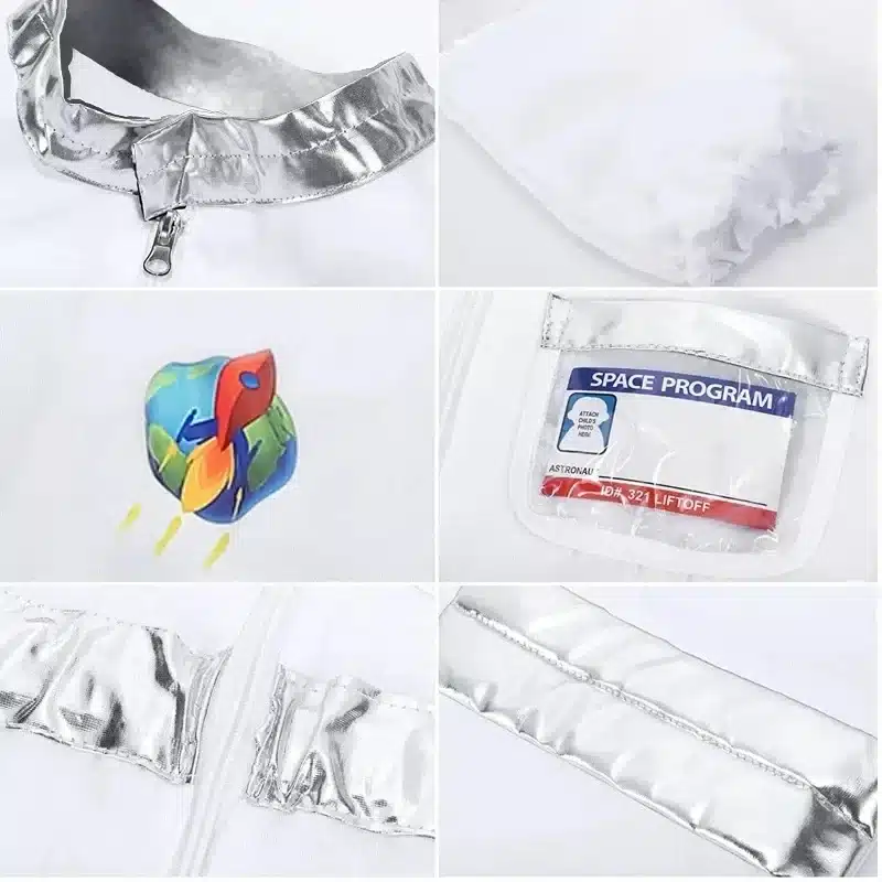 התחפושת מעוצבת בסגנון אסטרונאוטים קלאסי, בהשראת חליפות החלל של סוכנות נאס״א. העיצוב כולל הדפסים ברורים של סמלים, תגי משימה ופרטים גרפיים שמעניקים תחושה אותנטית ומרשימה. המראה הכללי משדר מקצועיות והרפתקה, ומאפשר לילדים להרגיש כמו אסטרונאוטים אמיתיים שיוצאים למשימה בחלל. זהו יתרון משמעותי עבור ילדים שאוהבים עולם מדע, חלל, כוכבים וטכנולוגיה.
